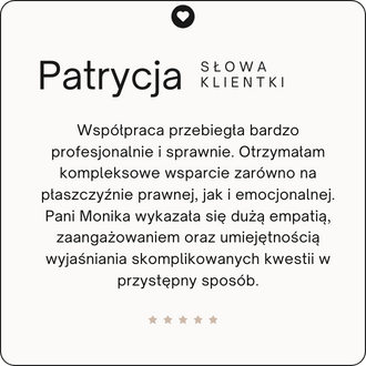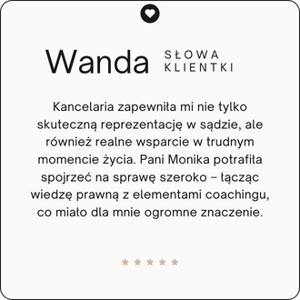 z wieloletnim doświadczeniem prawniczym i unikalnym podejściem coachingowym, oferuję kompleksowe wsparcie w rozwiązywaniu złożonych problemów prawnych oraz w osiąganiu osobistego i zawodowego rozwoju. Przeprowadzam przez rozwód i zmianę. Moim priorytetem jest budowanie trwałych relacji opartych na zaufaniu i zrozumieniu indywidualnych potrzeb każdego Klienta.